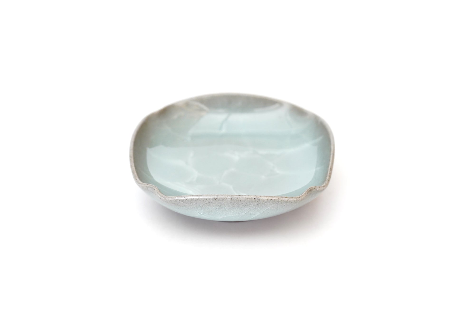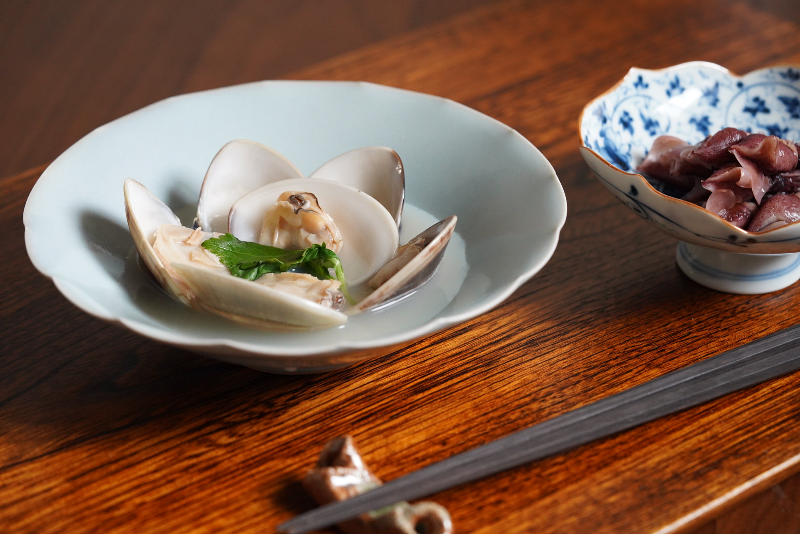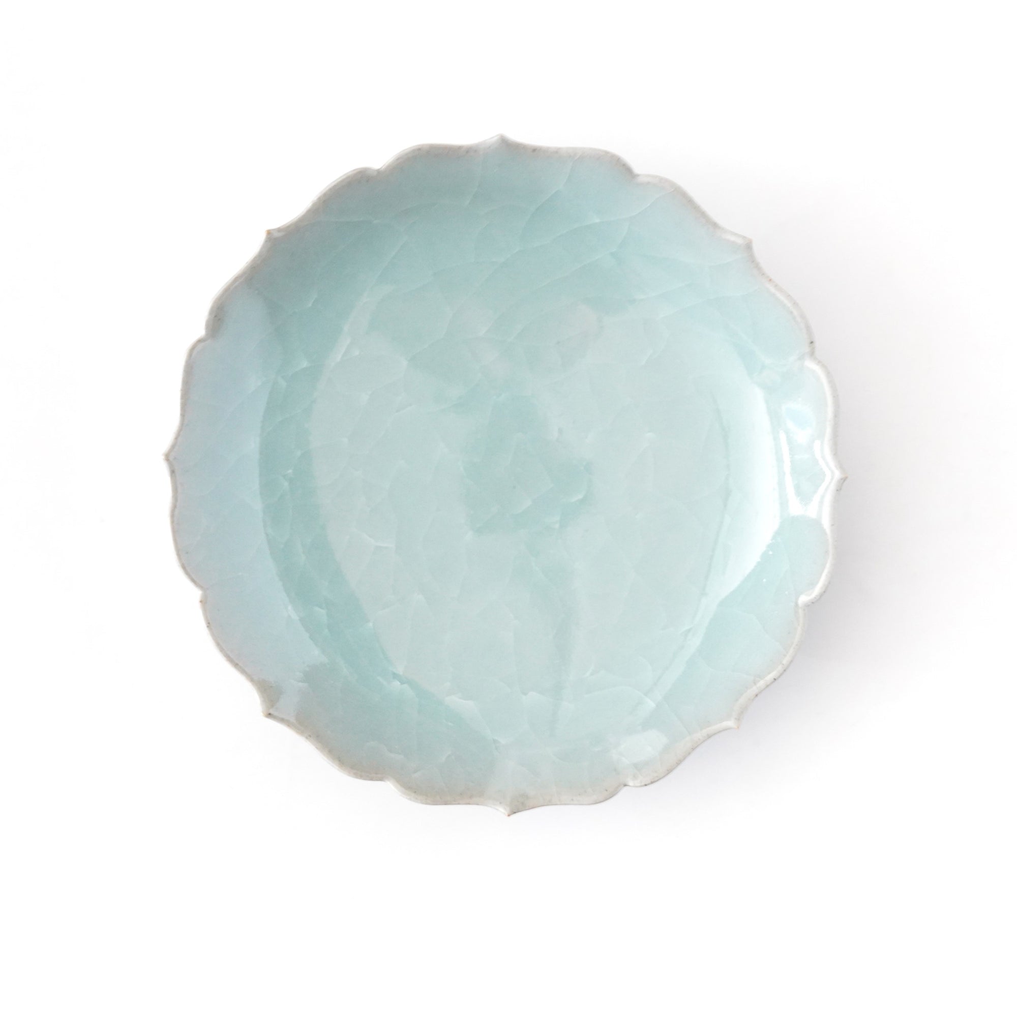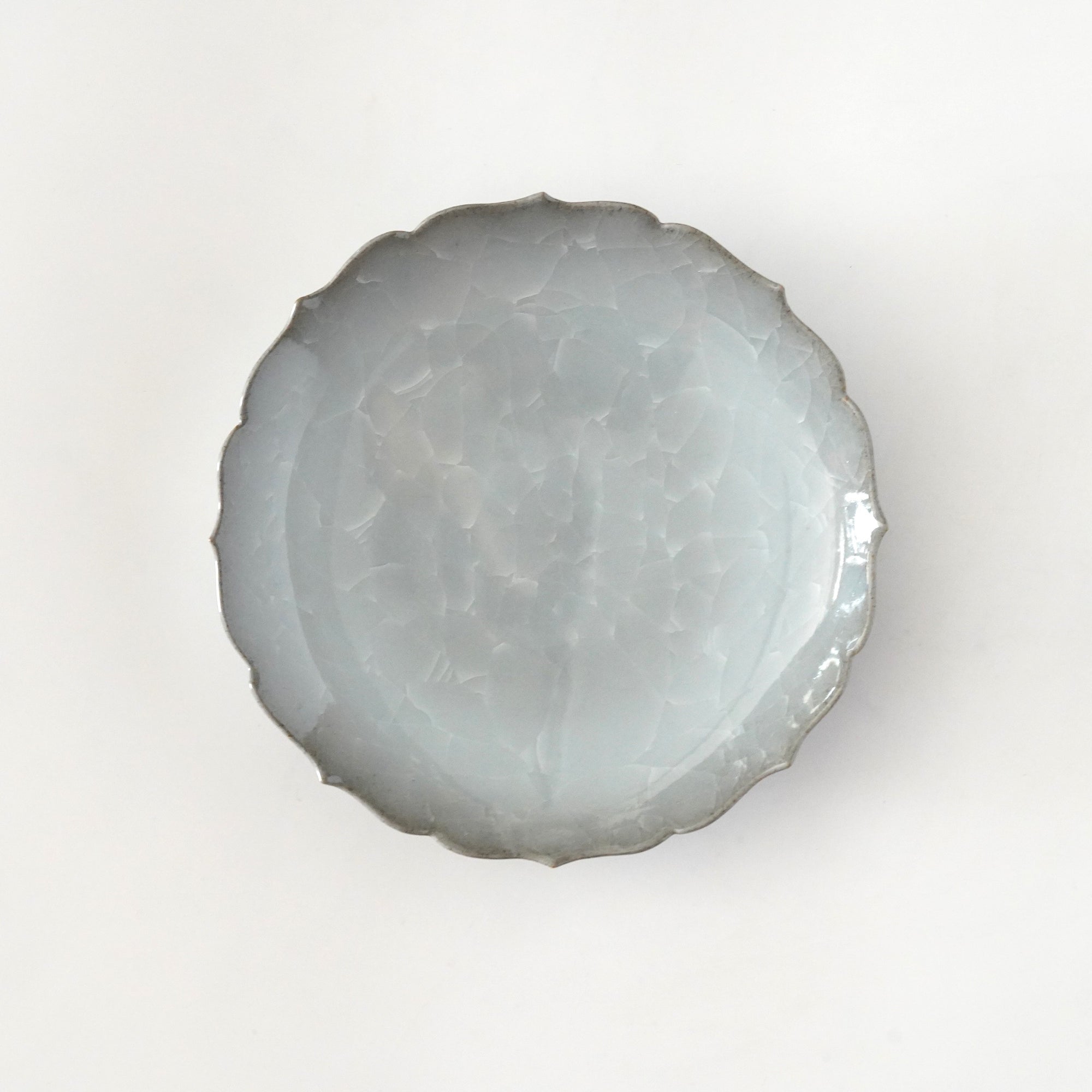 The pale and gentle color of the blue porcelain and the beautiful ice fissures are delicate and beautifully complement the dishes.